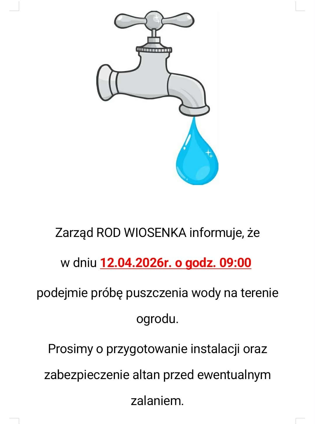 Zarząd ROD WIOSENKA informuje, że w dniu 06.04.2024r. o godzinie 12:00 podejmie próbę puszczenia wody na terenie ogrodu.